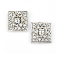 in metallo dorato, grani sfaccettati di mezzo cristallo montati a ricamo pavé, conterie nei toni del bronzo, miele e trasparenti. Composta da bracciale rigido e paio di orecchini a clip.