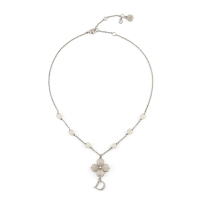 in metallo argentato, cristalli trasparenti e pasta vitrea opalina. Ciondolo centrale con quadrifoglio e iconica lettera D.
