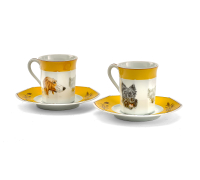 in porcellana di Limoges ocra e bianca. Due tazze ottagonali con piattino. I disegni rappresentano uno Scottish Terrier e un Poitevin.