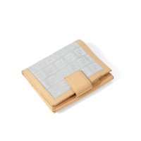in tela Zucchino azzurro lucido/opaco e pelle cammello. Interno in pelle cammello, due scomparti portasoldi, dieci spazi portatessere. Chiusura con pattina fermata da poussoir. Una tasca portamonete posteriore chiusa da patta in pelle fermata