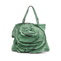 in nappa verde acido e nero, interno in tessuto nero. Doppio manico regolabile in pelle, chiusura a scatto. Grossi petali in tinta formano una rosa frontale. Hardware in metallo argentato.