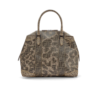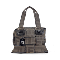 in tela intrecciata stampa Zucca e dettagli in vernice nera. Interno in tessuto marrone logato. Doppio manico in tela Zucca. Chiusura con cerniera fermata da grosso tiretto logato, charms logato in vernice nera amovibile. Hardware in metallo argentato.