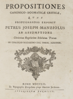 [Critica canonica]. Prima ed unica edizione dell'opera Propositiones dogmaticae criticae canonicae quas propugnandas exponit di Pietro Giuseppe Manzioli, stampata a Roma da Giovanni Zempel nel 1752 con marca tipografica al frontespizio. Nel lotto anche la rara Selecta leggi tutto