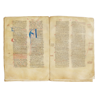 [Manoscritti miniati]. Lotto composto da fogli di 3 diversi manoscritti con iniziali ornate. Include: 7 fogli pergamenacei (179 x 125 mm), con testo in doppia colonna, 13 eleganti iniziali filigranate in rosso e blu, testatine e numerazione dei versetti in rosso e blu, leggi tutto