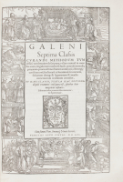 In 2° (348 x 250 mm). Frontespizio incorniciato con bordura figurativa per tutte le parti, il primo frontespizio stampato in rosso e nero. Contiene: Opera ex sexta Iuntarum, Galeni