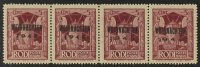 1944 - Natale di Rodi 5 c. striscia orizzontale di quattro con due esemplari del I tipo e due del II tipo - Dentellatura centrale parzialmente "aperta"