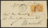 1879/85 - Due lettere entrambe da Tunisi per Trapani e Marsiglia affrancate rispettivamente con I emissione 2 c. rosso bruno isolato e 10 c. ocra coppia orizzontale - Insieme non comune e di grande interesse per lo specialista - Da esaminare - Firma Colla