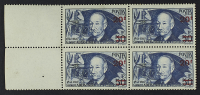 1927 - Soprastampati 50 c. / 65 c. blocco di quattro angolo di foglio inferiore destro - Esemplare in basso a destra non soprastampato a causa di piega diagonale (soprastampa obliqua nel margine) - Non comune - Cert. Behr