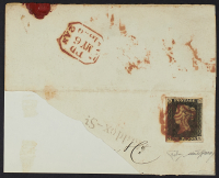1840 - Prima emissione 1 p. nero - Insieme di sette lettere di qualità selezionata - Unito un esemplare sciolto usato e alcuni francobolli di Francia e Giappone - Un certificato