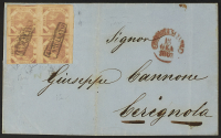 1858 - 50 gr. rosa brunastro + 1 gr. II tavola carminio + 2 gr. III tavola rosa chiaro coppia verticale in affrancatura "tricolore" su lettera del 27 novembre 1860 da Napoli per Marsiglia - Indirizzo parzialmente rifatto - Da esaminare - Cert. Diena - Firma Chiavarello