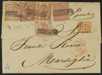 1858 - 50 gr. rosa brunastro + 2 gr. III tavola rosa chiaro + 5 gr. I tavola rosa mattone + 10 gr. I tavola rosa brunastro scuro + 20 gr. I tavola rosa brunastro in affrancatura "pentacolore" su lettera del 19 febbraio 1859 da Napoli per Marsiglia - Alcuni difetti da leggi tutto