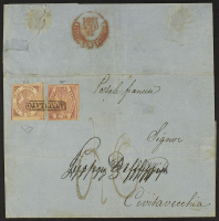 1858 - 50 gr. rosa brunastro + 10 gr. II tavola carminio rosa su lettera del 26 gennaio da Napoli per Civitavecchia - Indirizzo parzialmente cancellato - Da esaminare il solo 10 gr. ma alto valore ben conservato - Cert. Diena - Unita altra lettera molto rovinata e leggi tutto
