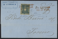 1861 - Da Livorno / Via di mare - Lineare in rosso su due righe annullatore di 20 c. azzurro e ripetuto a lato su lettere del 12 giugno per Torino - Francobollo ben marginato e documento di grande freschezza - Cert. Savarese - Firme Chiavarello e A. Diena