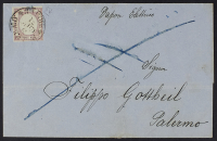 1861 - 5 gr. rosso annullato in arrivo con il cerchio semplice di Palermo su lettera del 6 giugno 1862 da Napoli - Unita lettera analoga dell'8 giugno 1861 con 5 gr. lilla annullato con il cerchio borbonico "Palermo - Arrivo" - Insieme di rarità estrema - Documenti leggi tutto