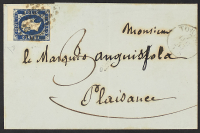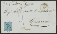 1853 - 20 c. azzurro con annullo a penna su lettera tassata del 29 marzo 1854 per Genova