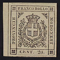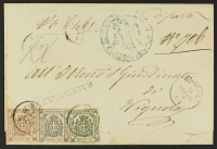 1859 - 5 c. verde + 20 c. ardesia violaceo + 40 c. carminio brunastro affrancatura "tricolore" su involucro di lettera del 28 novembre 1860 indirizzata a Vignola e annullata con timbri a cerchio semplice di Modena e stampatello diritto "Raccomandata" - Cert. Bottacchi