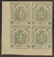 1859 - 5 c. verde blocco di quattro angolo inferiore sinistro di foglio - Cert. Bolaffi e Cardillo
