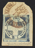 1860 - "Croce" 1/2 t. azzurro cupo su piccolo frammento annullato a Napoli il 21 febbraio 1861 - Splendido ed eccezionalmente marginato - Cert. Bolaffi e Diena