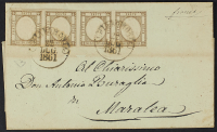 1861 - 1/2 gr. bistro bruno striscia orizzontale di quattro esemplari su lettera del 22 luglio da Chiaromonte per Maratea - Cert. Diena