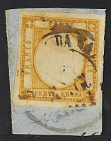1861 - 20 gr. giallo arancio su piccolo frammento - Cert. Bottacchi