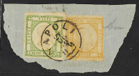 1861 - 1/2 t. verde giallo + 20 gr. giallo arancio effigie capovolta su piccolo frammento - Molto raro - Da esaminare - Cert. Diena