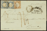 1861 - 10 gr. arancio II tipo effigie C in affrancatura con 2 gr. azzurro due esemplari su lettera del 12 aprile 1862 da Napoli per Roma - Minimi punti di ruggine al bordo superiore dei francobolli - Ex collezione Rothschild - Cert. Diena - Firma A.G. Bolaffi