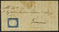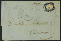 1861 - Gazzuolo T. L. manoscritto a lato di Sardegna IV em. 20 c. azzurro scuro annullato con doppio cerchio con losanga a Bozzuolo su lettera del 25 aprile per Genova - Da esaminare - Rara - Cert. Ghiglione