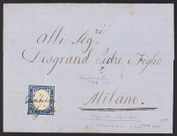 1860 - Oggionno - Linee verticali e orizzontali nitido annullatore di 20 c. azzurro su lettera del 4 maggio per Milano - Probabilmente la più bella lettera tra le poche conosciute - Cert. Sorani