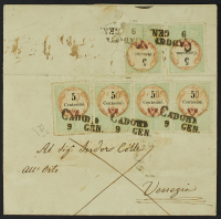 1854 - 5 c. tipografico due coppie orizzontali al recto e due esemplari al verso di lettera del 9 gennaio 1856 da Pieve di Cadore per Venezia - Affrancatura di grande rarità giunta franca a destino con gli esemplari che per motivazione ignota presentano uno zero scritto leggi tutto
