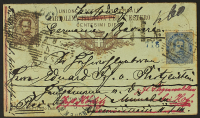 1882 - Cartolina postale per l'estero 10 c. con affrancatura complementare di 25 c. del 2 agosto 1893 da Venezia per Monaco di Baviera e rispedita ad altro indirizzo in città - Rispedita nuovamente il 9 agosto da Monaco per Venezia con il testo della risposta scritto leggi tutto