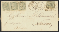 1852/63 - Definitiva 5 c. grigio verde tiratura di Londra tre esemplari su lettera da Spoleto per Narni rispedita a Roma riaffrancando con Pontificio 2 baj. bianco verdastro (probabile riutilizzo in frode) annullato con bollo a griglia di Civita Castellana - Documento leggi tutto