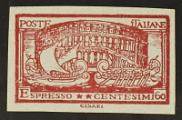 1922 - Espresso 60 c. - Prova xilografica in rosso preparata da Giulio Cisari per la serie "Artistica" non emessa