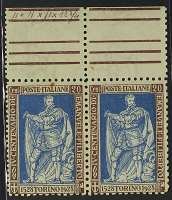 1928 - Emanuele Filiberto 20 c. coppia orizzontale con esemplare di destra dent. 11 ed esemplare di sinistra dent. 13 1/2 - Cert. Diena