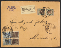 1924 - 25 c. Tagliacozzo coppia orizzontale in affrancatura con Floreale 1 L. due esemplari su raccomandata del dicembre da Roma per Madrid