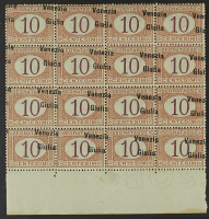 Emissione Venezia Giulia 10 c. arancio a carminio blocco di sedici esemplari con soprastampa obliqua