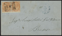 1867 - "San Marino" annullatore di 10 c. arancio coppia orizzontale su lettera del 15 aprile per Brescia - Cert. Diena