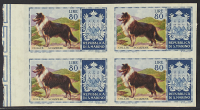 1956 - Cani 25 L. + 80 L. blocco di quattro + 100 L. tutti non dentellati - Cert. Caffaz - Firma Savarese