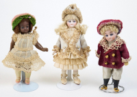 corpo in pelle di capra con dita separate, testa di porcellana fine con pittura fine, bocca chiusa, vecchia parrucca, vestiti nuovi cuciti in tessuto vecchio.