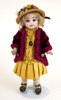timbro rosso Tete Jumeau Depose 3, corpo di composizione originale, marcato con timbro blu, occhi blu Paperweight, bocca chiusa, parrucca originale in mohair biondo, vestiti nuovi.