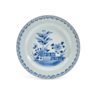 Porcellana dipinta in blu di cobalto sotto invetriatura, la superficie a vista con uno scorcio di giardino con fiori e staccionata.