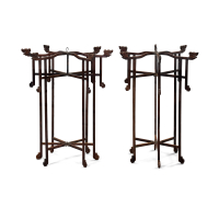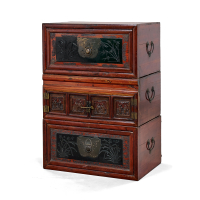 Legno intagliato e accessori in metallo, tre sezioni sovrapposte, il davanti delle sezioni superiore e inferiore con motivi floreali, il davanti della sezione centrale con quattro composizioni con figure nel paesaggio entro formelle quadrate.