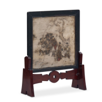 Legno, sul fondo scena a lacca con due figure, l'orlo sottolineato da sottile treccia in metallo, marchio a quattro caratteri al centro della base.