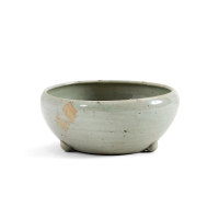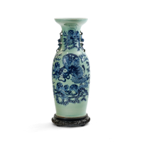 Porcellana con invetriatura céladon e decoro in blu di cobalto, sul corpo scena con leoni buddhisti, prese a coppia di leoni che si affrontano.