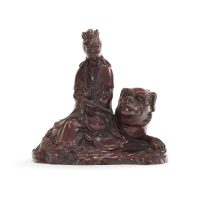 Bronzo a patina rossastra, la divinità buddhista seduta sul dorso di un leone.