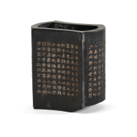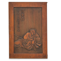 Legno intagliato, su un lato figura di saggio e iscrizioni in rilievo.