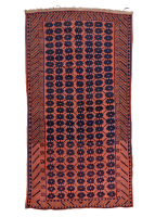 Fondo rosso con decoro policromi di motivi floreali e geometrici stilizzati.