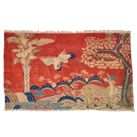 Fondo rosso, decoro policromo di paesaggio con cervo, gru e alberi.