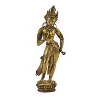 Bronzo dorato con tracce di pittura, la divinità seduta in posizione lalitasana su base a doppio fiore di loto, nelle due mani uno stelo fiorito, la testa coronata e sul petto diversi gioielli.