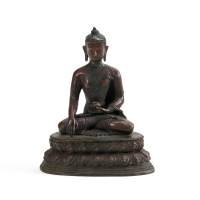 Lega di rame, la divinità seduta a gambe incorciate su base a doppio fiore di loto, nel palmo della mano destra una ciotola, suo usuale attributo.