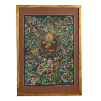 Bronzo dorato con intarsi turchesi, la divinità del Buddhismo tibetano raffigurata stante su base a fiore di loto e i piedi su due piccole figure, il braccio destro sollevato a brandire una spada, il volto con espressione irata.